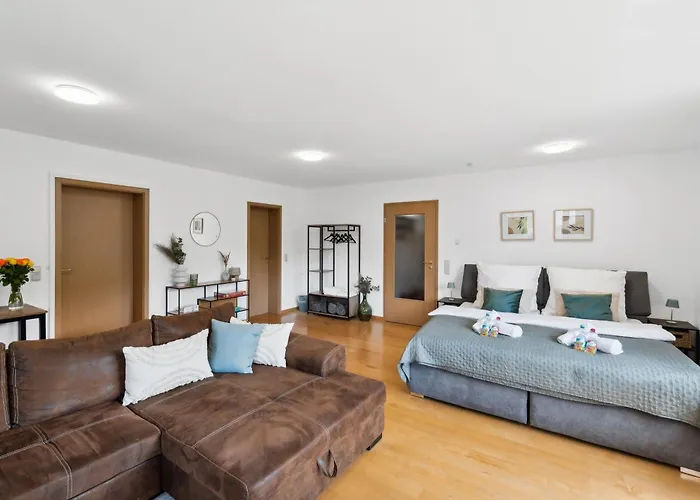 Nestled around 4 km from Schloss Fohren Castle, the 60 m^2 Stern12 Sirius Kuche Wlan Arbeitsplatz Parken Apartment Hetzerath allows guests to explore numerous tourist destinations in the vicinity. This 1-bedroom apartment offers a patio with views of the garden.